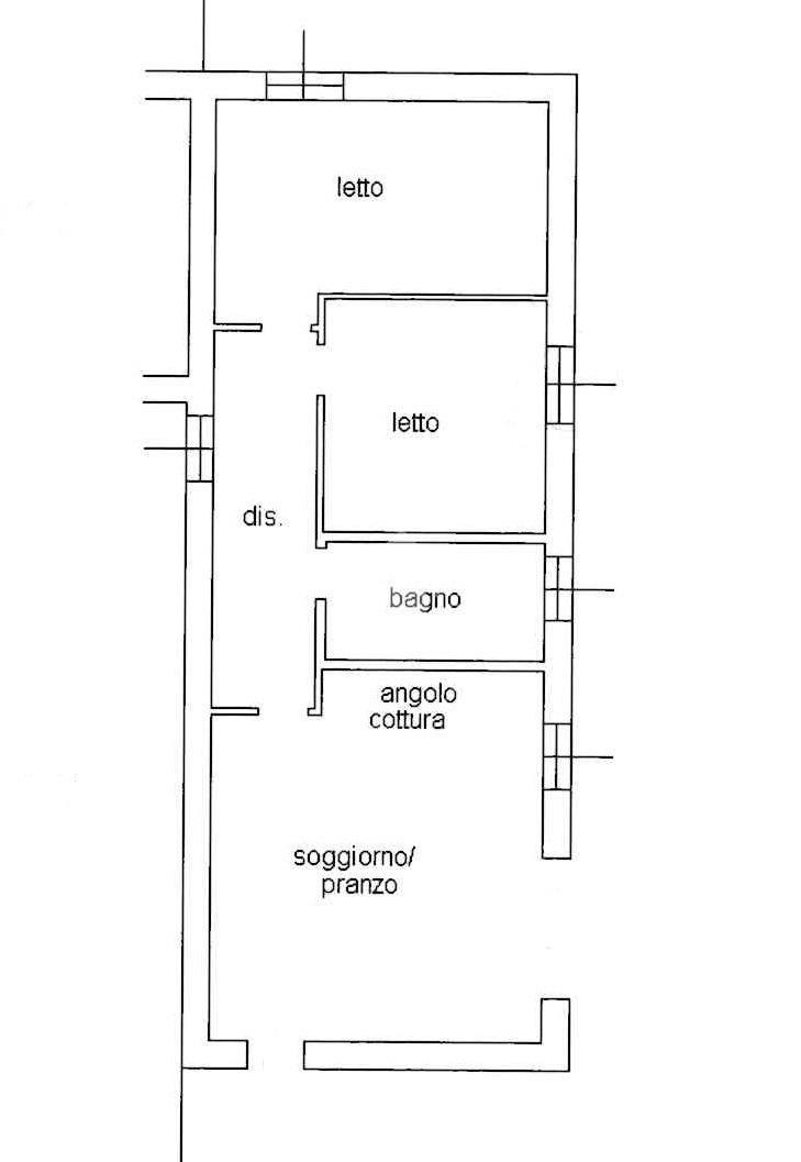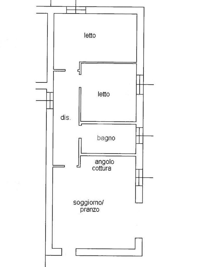 L'appartamento si compone di: ingresso su ampia zona pranzo/soggiorno con angolo cottura per una superficie complessiva di circa 30 mq, lungo disimpegno notte arredabile, bagno finestrato con doccia e 2 camere da letto di cui una matrimoniale e una doppia.